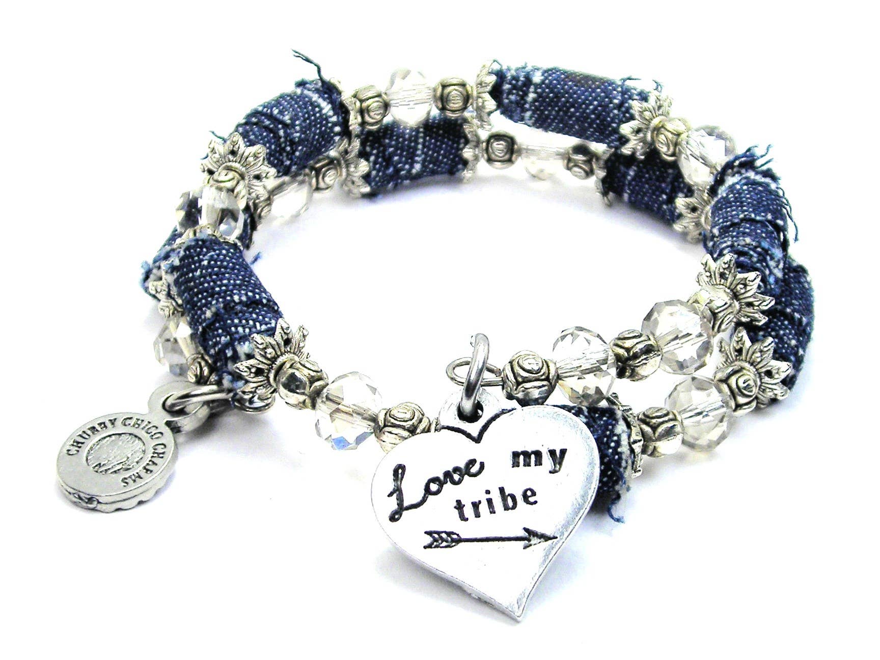 Distressed denim beaded bracelet. Who doesn't own a pair of jeans to match this Demin bracelet. Denim beads with crystal spacer beads. Original style. This lovely 22mm charm is hand cast and finished in the USA, using genuine 100% American pewter.