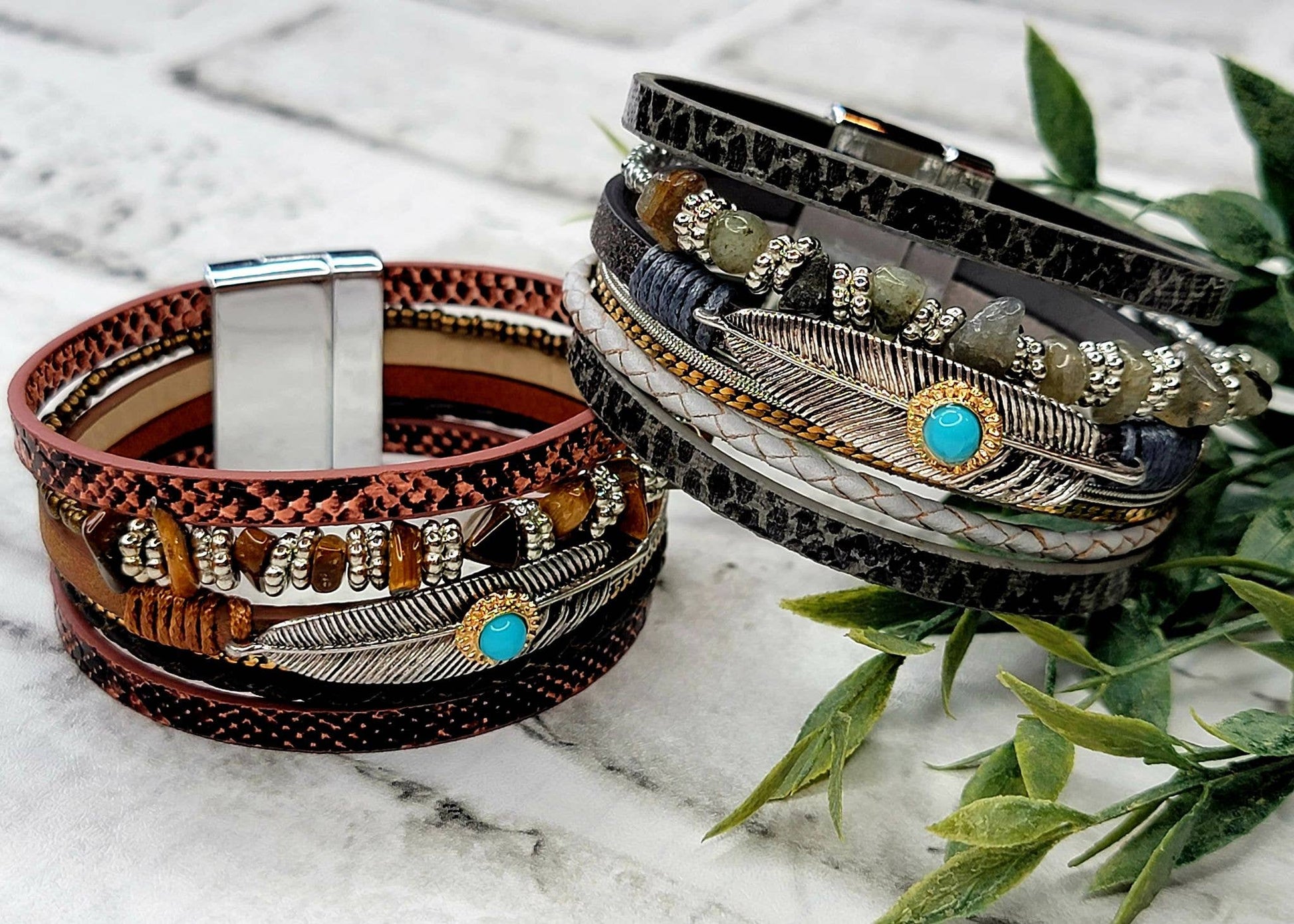 Magnetic Clasp Layered Stacked Bracelet Feather Turquoise Black